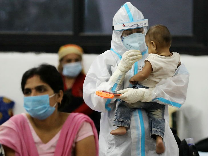 नई दिल्ली के इंडोर स्पोर्ट्स कंपलेक्स क्वारैंटाइन सेंटर में एक बच्चे के साथ खेलती स्वास्थ्यकर्मी।